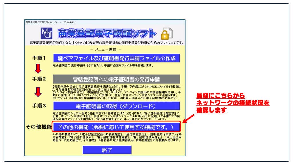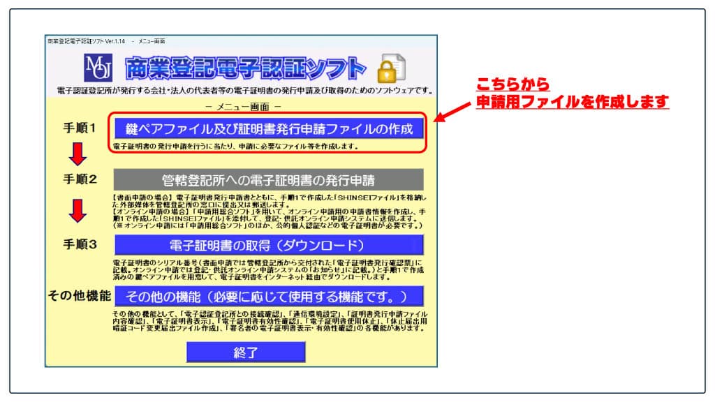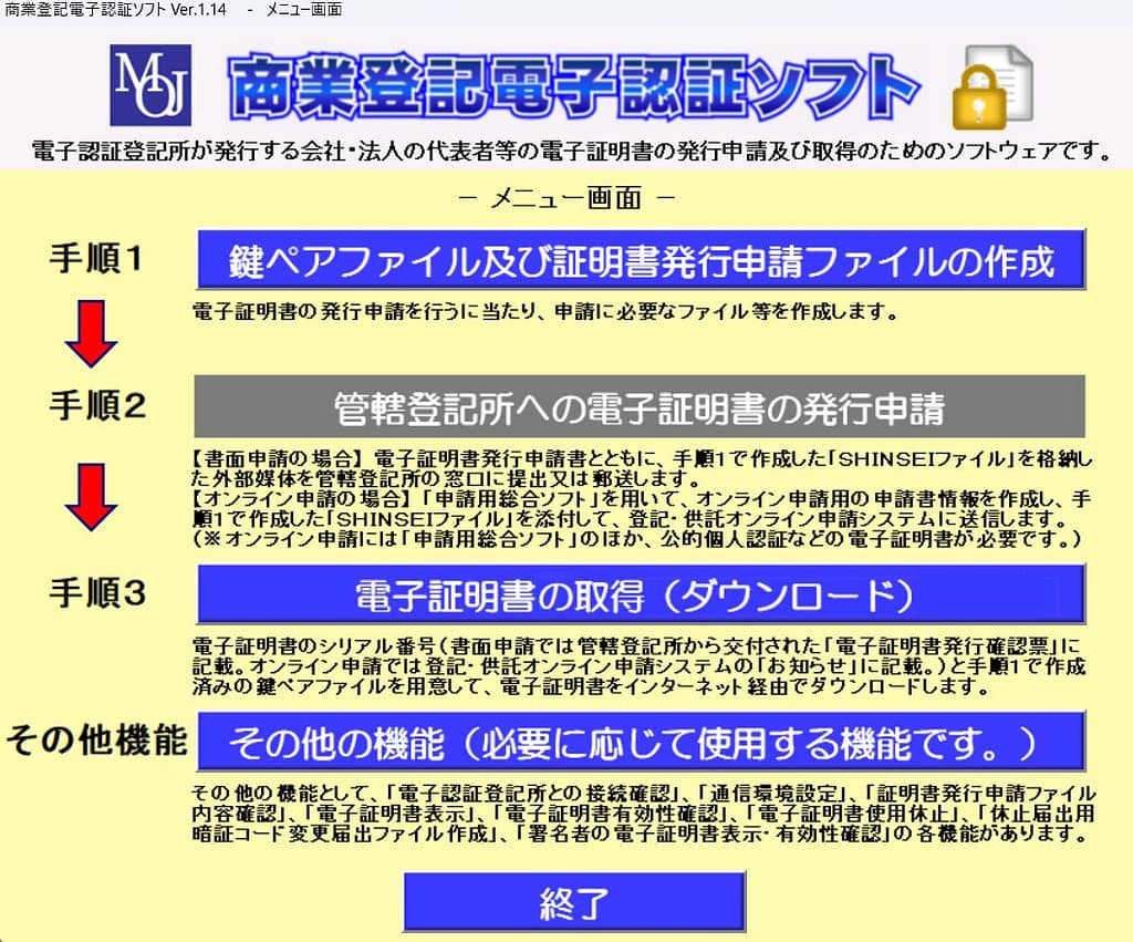 商業登記電子認証ソフトを起動すると、以下のような画面が現れます。