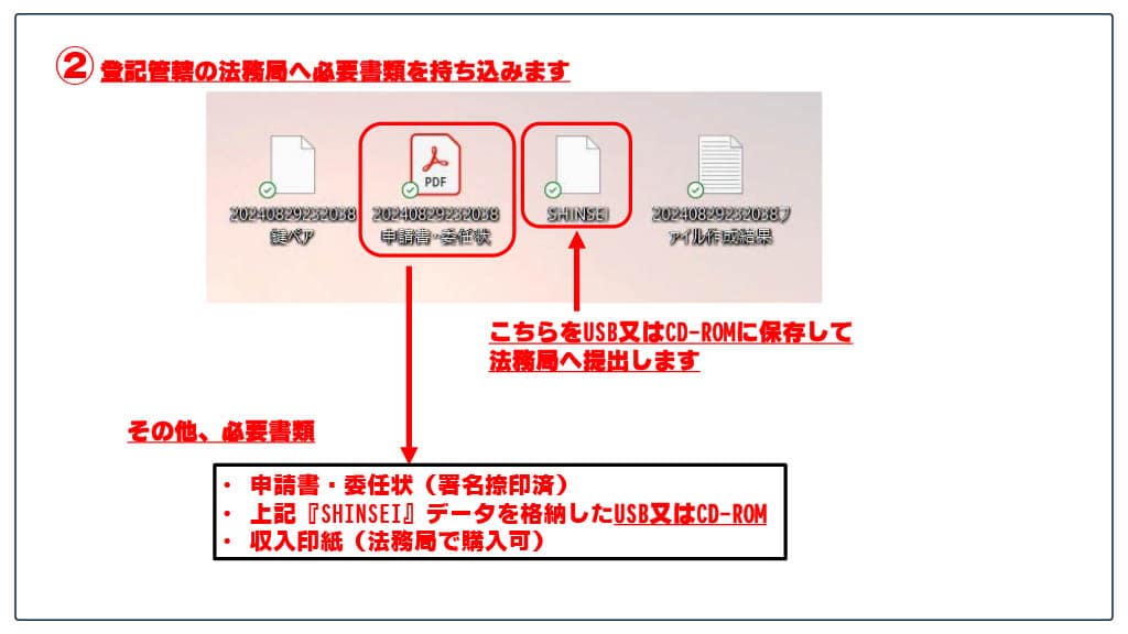 書類の準備が整ったら管轄の法務局へ必要書類を提出しに行きます。