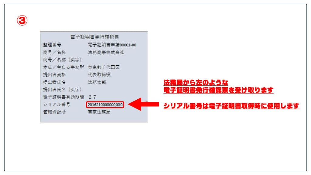 電子証明書のシリアル番号が記載された『電子証明書発行確認票』を法務局から受け取ります。