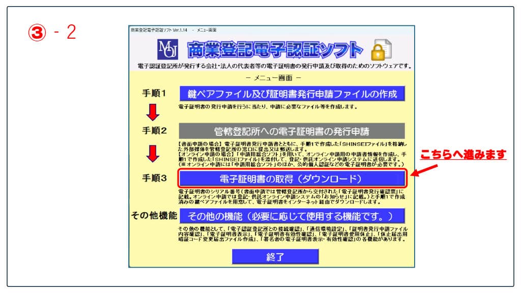 『電子証明書発行確認票』を受け取ったら、商業登記電子認証ソフトを起動して、『電子証明書の取得』クリックします。