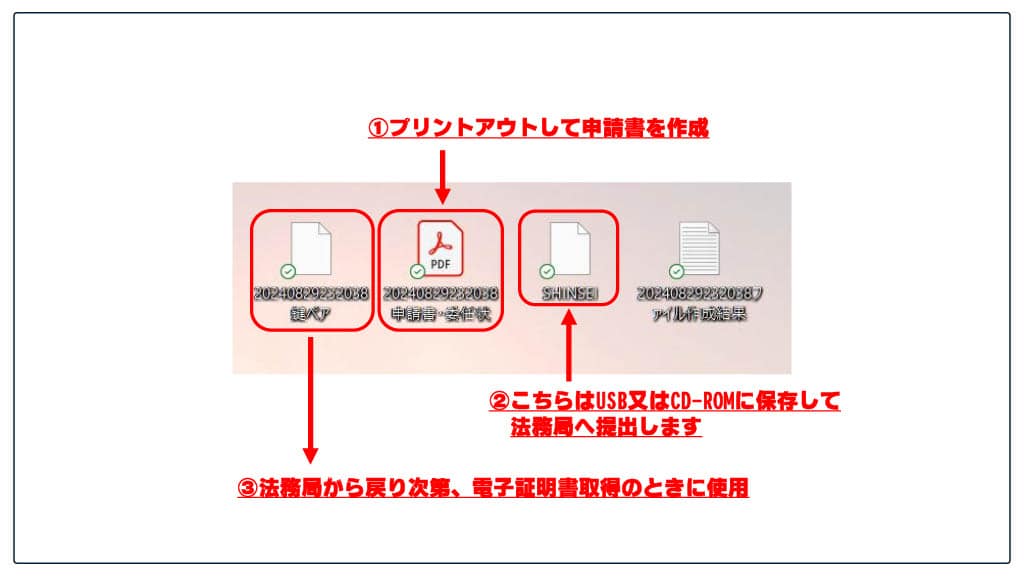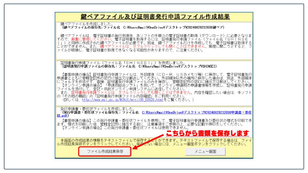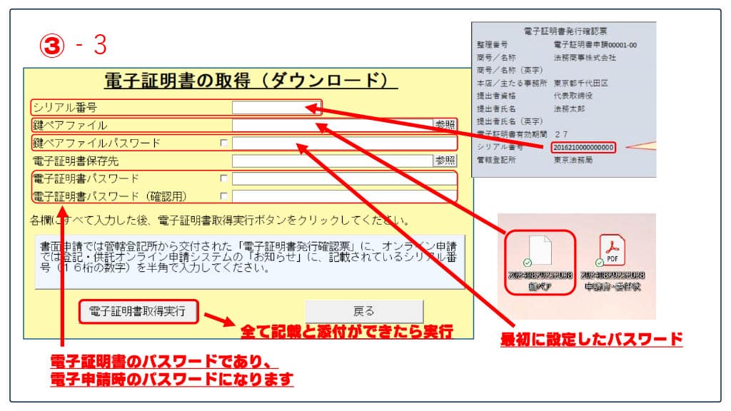 ③『鍵ペアファイル』は、法務局からシリアル番号を受け取り、電子証明書を取得するときに使用します。