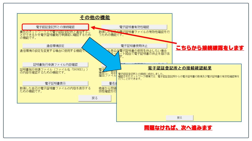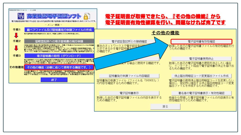 最後に、『その他機能』から『電子証明書有効性確認』を行い、問題がなければ完了です。
