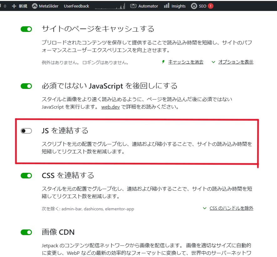 その中で、『JS を連結する』をオフにすると問題が解消されました。