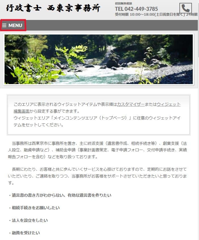 今回は、スマホでHPを表示したときに、ホーム画面だけハンバーガーメニュー(≡ MENUの部分)が表示されない(展開されない)不具合が発生しました。