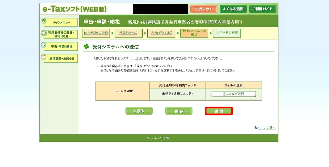 登録申請書の保存や、送信した手続きの受信通知を格納するフォルダをここで選択できます。