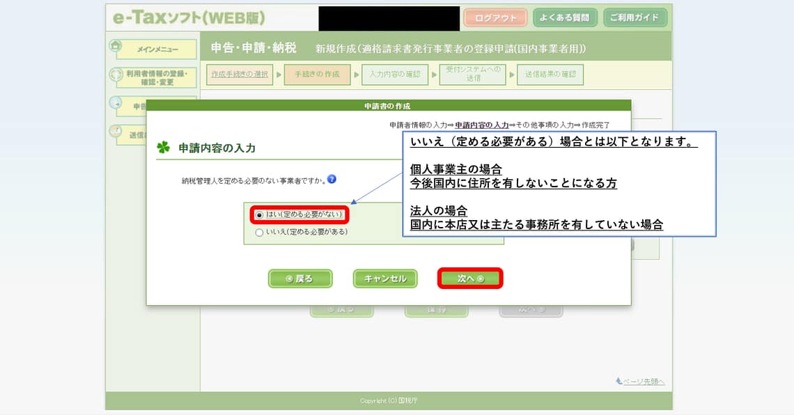 ⑯日本で事業をされる方は『はい(定める必要がない)』にチェックを入れて進みます。