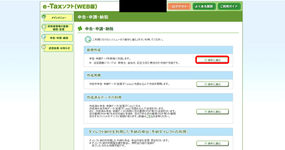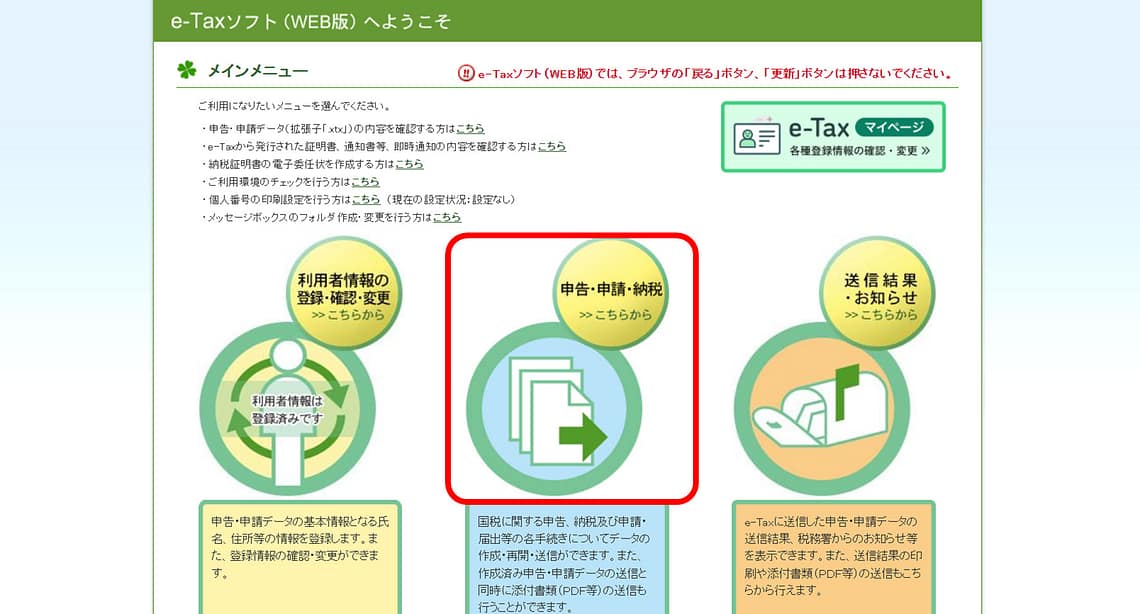 登録済みとなりましたら、『申告・申請・納税』をクリックします。