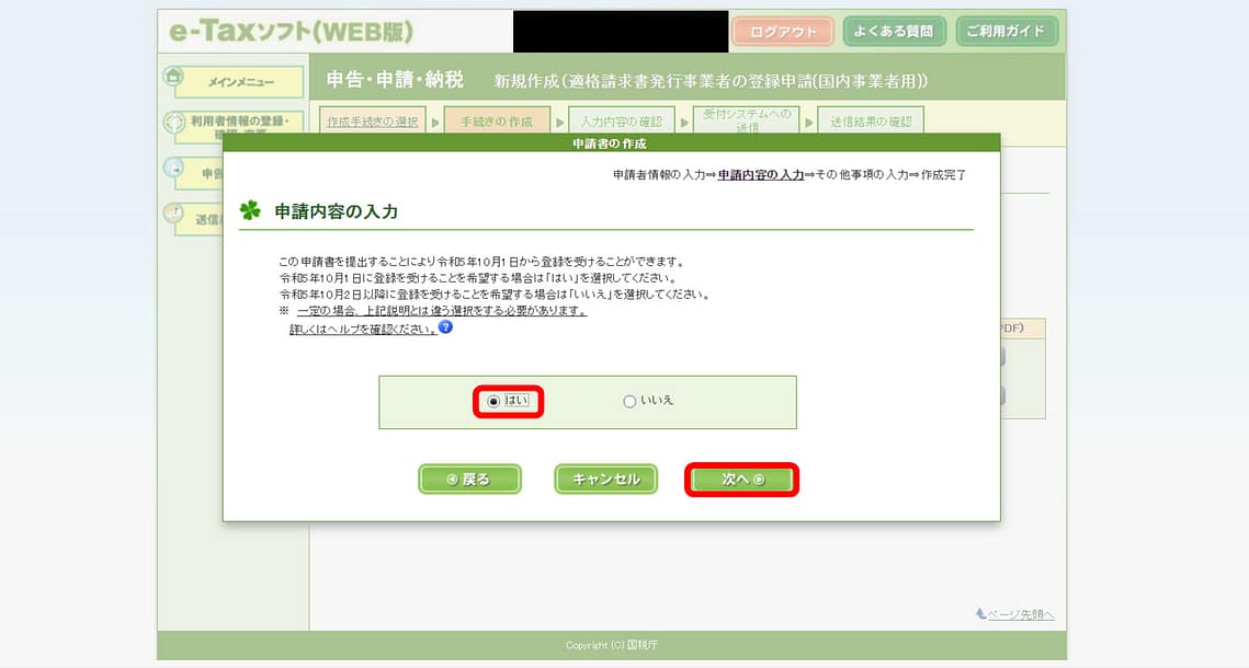 ⑭ここで、10月1日のインボイス制度スタートと同時に登録を希望する方は『はい』にチェックを入れましょう。
