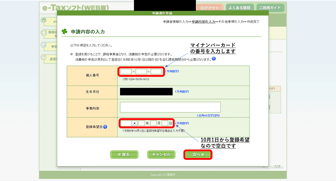 2023年3月31日までに登録申請をする方は、インボイス制度開始の10月1日から課税事業者となれますので、登録希望日は空欄のままで進みます。