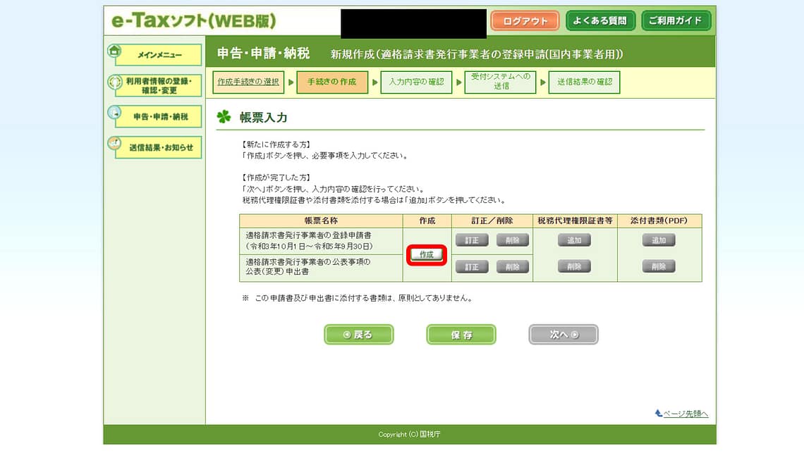 ⑨次へを押すと帳票入力画面となりますので、作成をクリックします。