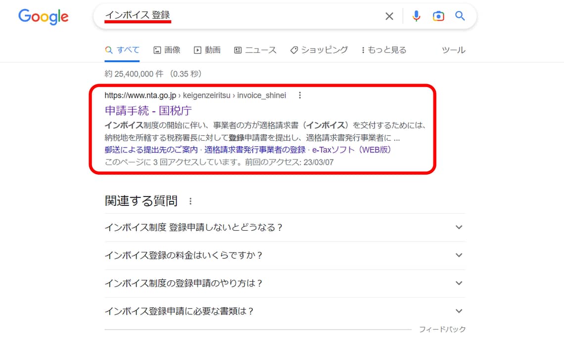 ①まずは、『インボイス 登録』と検索をすると、『申請手続 - 国税庁』がヒットしますので、こちらをクリックしてください。