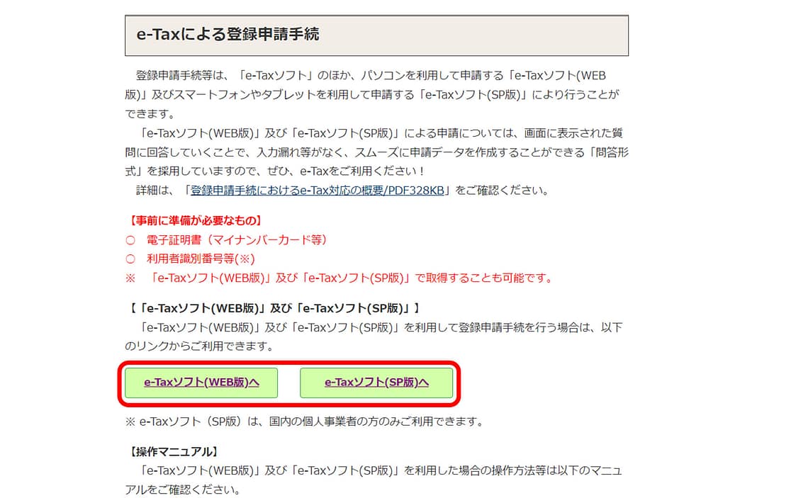 ②ウェブページの中段あたりに『e-Taxによる登録申請手続』という項目がありますので、パソコンを使用して申請する方は『e-Taxソフト(WEB版)へ』、スマートフォンやタブレットで申請する方は『e-Taxソフト(SP版)へ』をクリックしてください。