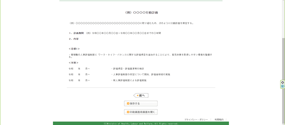 上記ページで、「行動計画名」や「行動計画の策定目的」、「計画期間」などを記載し次へ進みます。