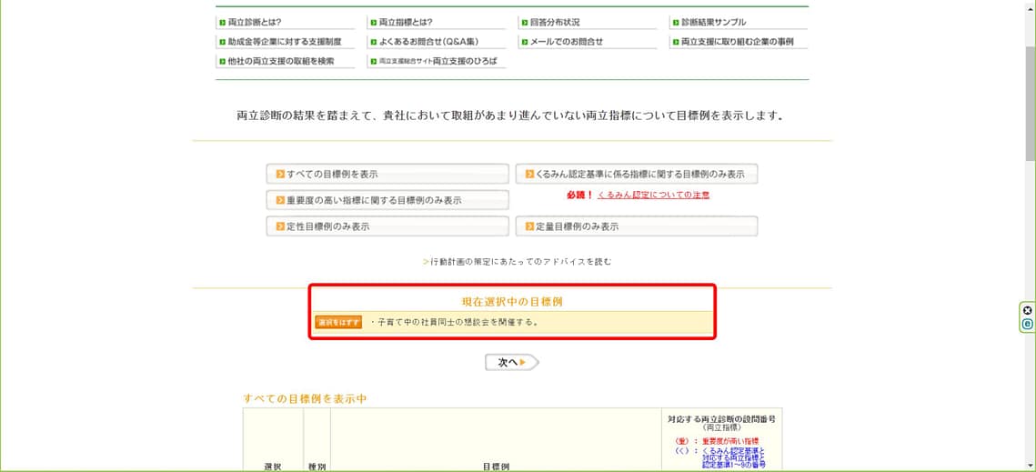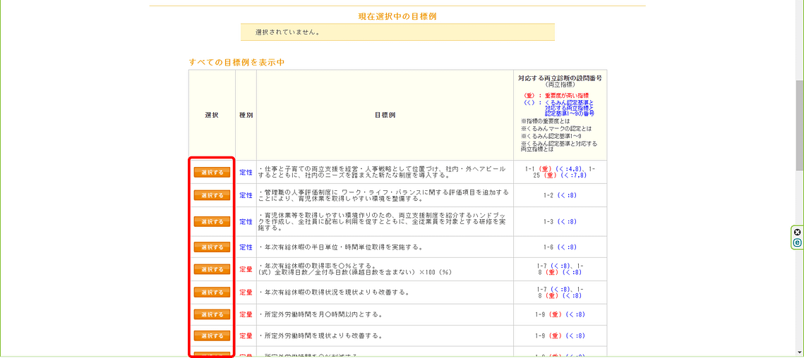 項目を選択すると、選択中の目標例が上記箇所へ表示されます。