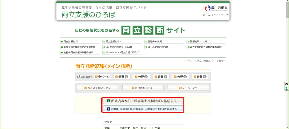 全ての回答が済むと「回答内容から一般事業主行動計画を作成する」をクリックします。