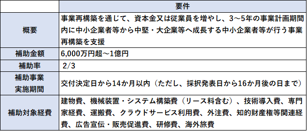 ⑤事業再編等要件(事業計画期間内に、事業再編、新規設備投資、グローバル展開のいずれかにより、資本金又は従業員を増やし「補助対象事業者」に定める中小企業者等の定義から外れ、中堅・大企業等に成長すること)