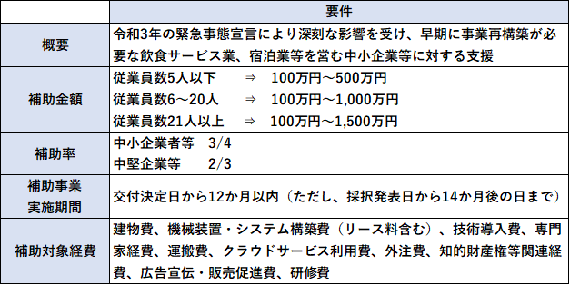 事業再構築補助金は、新型コロナウイルス感染症の影響が長期化し、当面の需要や売り上げの回復が期待しづらい中、ポストコロナ・ウィズコロナ時代における新分野展開、事業転換、業種転換、業態転換、事業再編という思い切った事業再構築をする中小企業等への支援を目的とするものです。