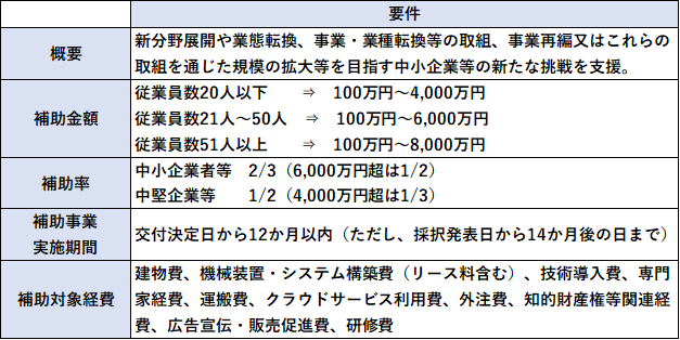 「新分野展開」、「事業転換」、「業種転換」、「業態転換」、「事業再編」の以下のいずれかの類型に該当することが必要です。(製品等の新規性要件、市場の新規性要件、売上高10%要件(新たな製品等の売上高が総売上高の10%以上)を満たす計画が必要)