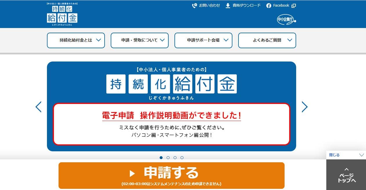 まずは、持続化給付金のページ(https://www.jizokuka-kyufu.jp/)へいくと上記のようなページとなります。