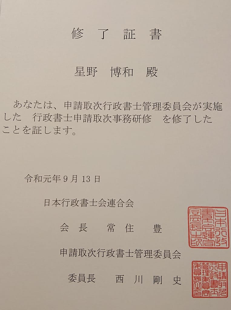 研修があったのは9月13日の金曜日で、9月27日に修了証が事務所に届きました。