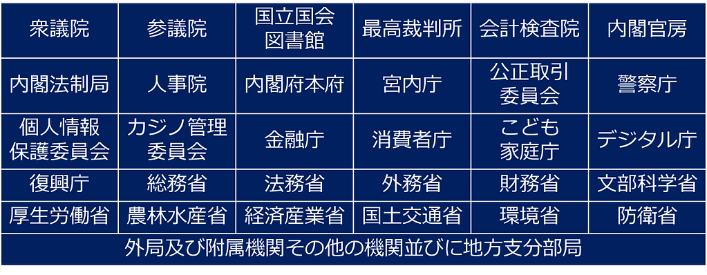 そのため、全省庁統一資格を持っていれば以下の全ての省庁へ入札することが可能になります。